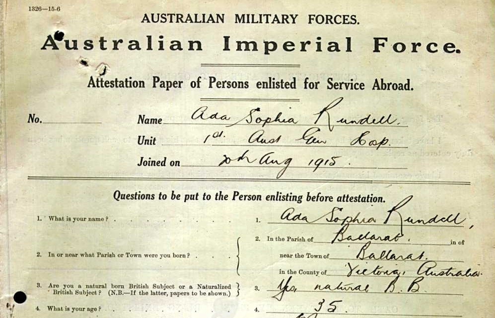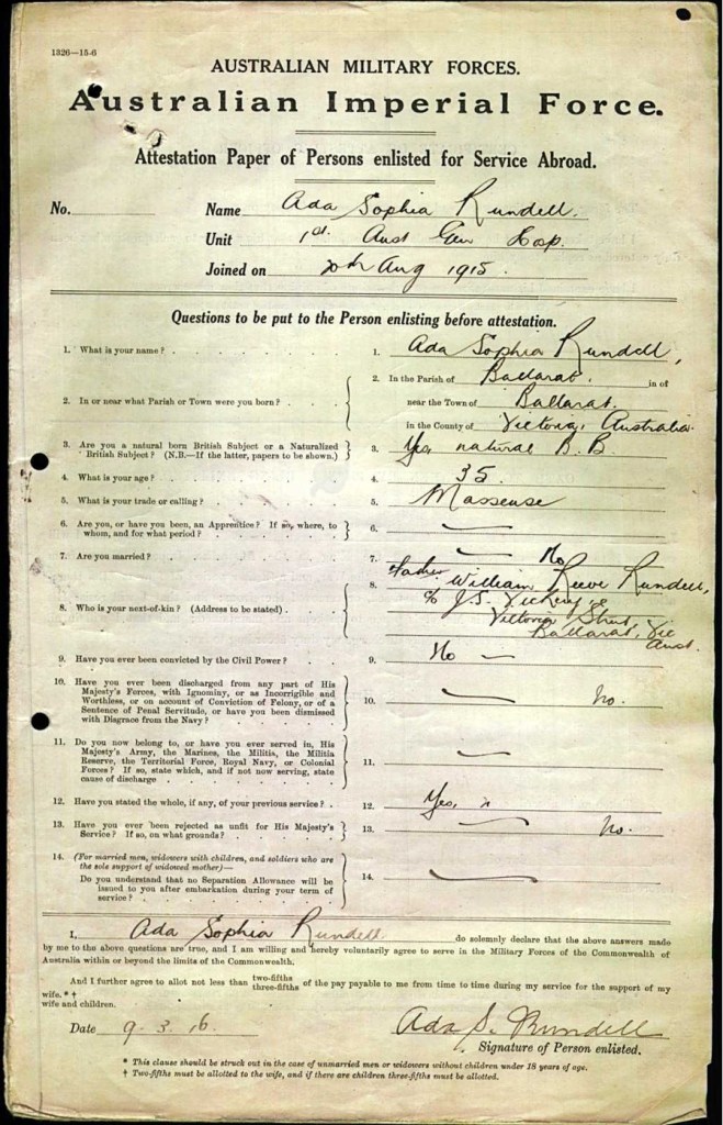 Ada Sophia Rundell was in the first contingent of masseuses (physiotherapists) sent overseas with the AIF. From 1915–1918, she worked in hospitals in England, France and England. Ada returned to Australia in 1919, working in Queensland where she married a terminally ill ex-soldier in 1921. She ran her own masseur establishment in Ipswich and later in northern NSW.