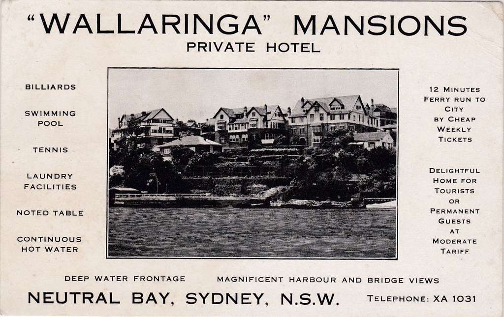 Another marriage provides some clues about the family’s situation. Edward Gordon Irving, a 24-year-old shipwright married 26-year-old Laura Beryl Williams on Saturday July 26th 1924 at St Cuthbert’s Church in Naremburn, the same church that his older sister Gladys had been married in. The marriage certificate has Edward’s residence as Mitchell Street, Crow’s Nest which is the address that his mother, Florence Winton Irving had from 1930 until her death. There were no published NSW electoral rolls during the 1920’s, so this could be where the family was living as early as 1921 when Gladys was married – her usual residence was listed simply as Crow’s Nest. Laura’s occupation was domestic duties and her residence was “Wallaringa Mansions” Neutral Bay, a quite famous property originally built in 1850’s and expanded as a solicitor’s family home before being used as a guest house and private hotel in the early 1900’s. Laura’s father was a pioneering grazier and miner from Moonan Brook about 30 km’s from Scone in the upper Hunter River region. Edward may have been employed at one of the many shipyards in and around Neutral Bay – the Wallaringa Mansions are only 4km’s from Mitchell Street. The two witnesses to the marriage are William Charles Dacey, Glady’s husband and Cecil Clarence Irving, Edward’s younger brother. Interestingly, E.T. Irving, Edward’s father, a photographer, is recorded as deceased; however, this is not the case.