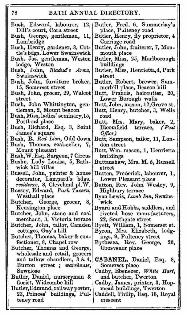 The 1852 business directory for Bath shows Ebenezer Cadby as a butcher, from the White Hart Inn in Twerton. It does seem that Ebenezer is forging ahead in the businesses of his father-in-law: inn keeping and butchering. Tragically it doesn’t last long as an obituary in 1855 states “May 1, at Twerton, aged 37, Mr Ebenezer Cadby, landlord of the White Hart Inn, in that place.”