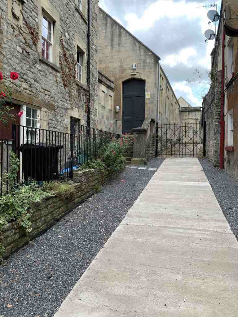 However, in 1878 the inn was purchased for the parish by the owners of the Cloth mills, Isaac and William Carr, to provide premises for the Twerton Club and Institute. A library and reading rooms (previously located near the lower mill) was provided in the western wing, accessed through a door at the front facing Mill Lane. A clock was later installed above the front windows. The present hall at the rear was also built, presumably on the site of the stables, and the ornamental iron gates and spur stones installed at the front. The eastern wing, which was separated as a private dwelling, was later converted to a small shop in the early 1900s. The Institute continued in use until about 1959 when the hall was given over for the formation of the St.Michael’s and All Angels’ Youth Club and the west wing for a private dwelling. In 1965 the shop in the east wing also closed and converted back to a dwelling.
