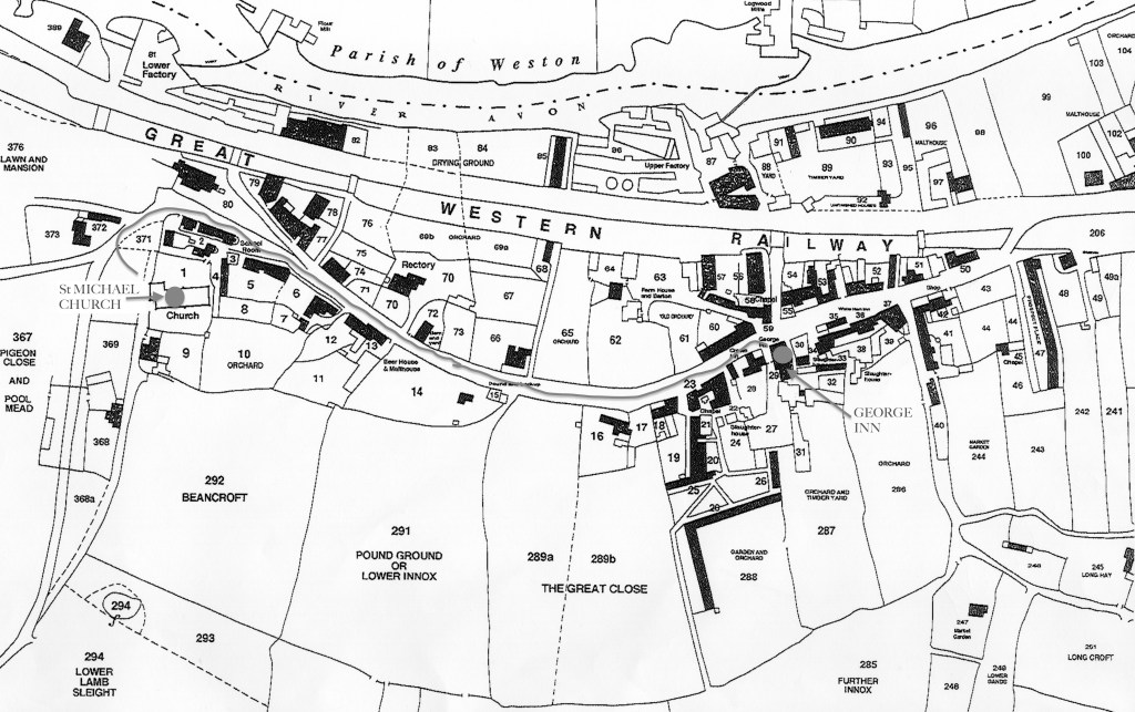 The funeral procession for Daniel Miles left from the George Inn, which no longer exists as a business, although the building still stands. However, there is a document titled “The High Street, Twerton an Historical Survey” by Mike Chapman published about 2003 which gives a very good overview of the buildings on High Street which include three inns or beer houses – the George Inn, the Old Crown Inn and the White Hart Inn.