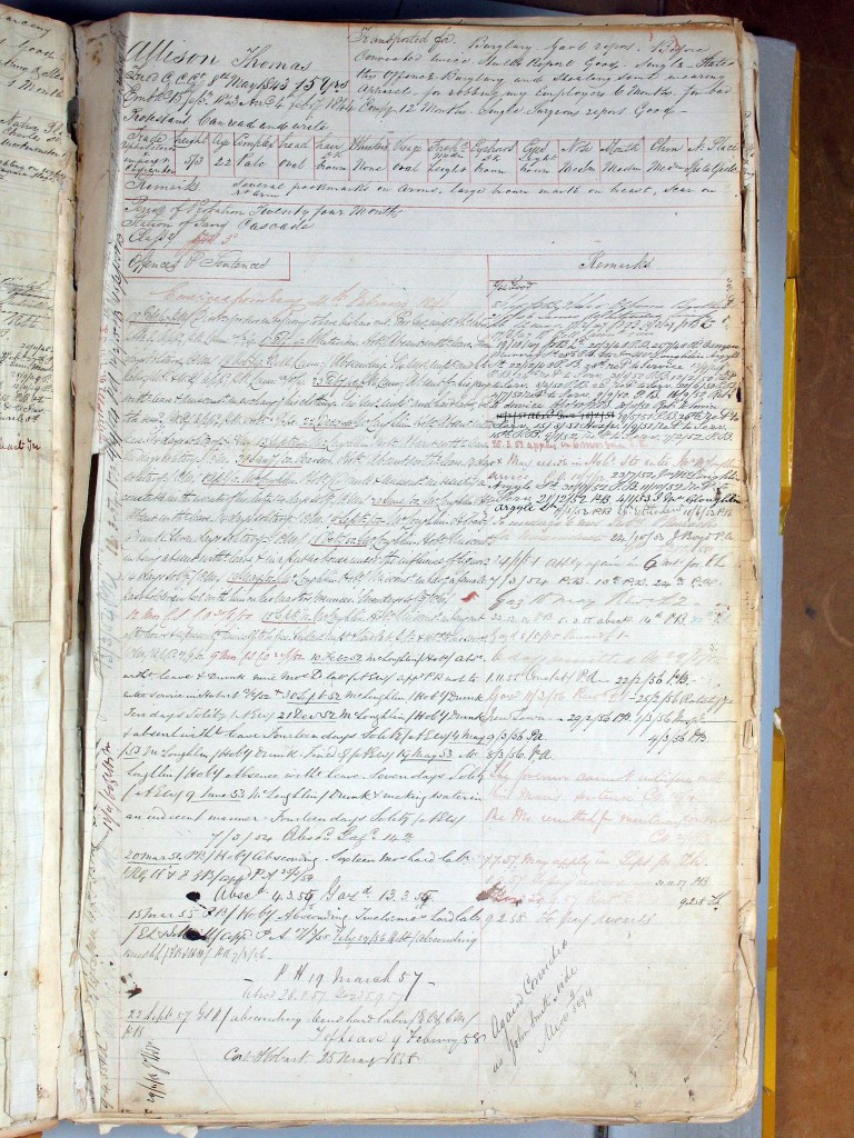 Thomas Allison in my view then became a convict who railed and fought the penal system every step of the way. His record sheet is the most extensive I have seen. He is a regular absconder, at least ten times and sometimes across Bass Strait to Victoria. He adopts aliases to prevent recapture. He even absconded from the Constables Station near Eagle Hawk Neck! The records show that he was denied permission to marry Elizabeth Brown in 1852, and that he did gain his Ticket of Leave in February 1858.