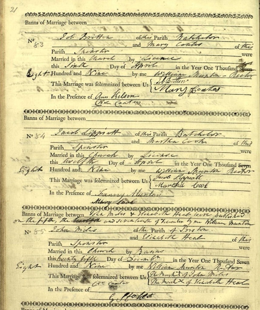 Four years later, at the end of April 1832, the eldest sister and oldest daughter in the family, Ann Miles (1815-1850) was married in Priston to a local man, George Bishop (abt.1803-aft.1881). Ann, who was 17 when married was probably actively involved in the upbringing of Sarah and her two younger brothers, John and Richard. The only other daughter in the family, Elizabeth (1822-1874) was seven years younger than Ann and two years older than Sarah. Ann and her husband George Bishop named their first born, a daughter, Sarah Bishop (1833-1846). Perhaps to acknowledge and/or to bond with her young aunt, Sarah Miles, who would have been about nine years old.