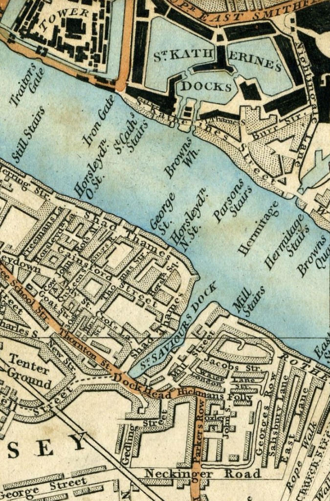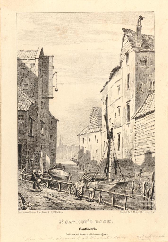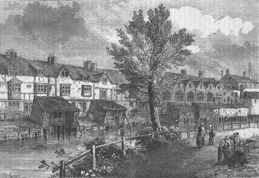 ‘Beyond Dockhead, in the Borough of Southwark, stands Jacob’s Island, surrounded by a muddy ditch, six or eight feet deep and fifteen or twenty wide when the tide is in, once called Mill Pond, but known in the days of this story as Folly Ditch. It is a creek or inlet from the Thames and can always be filled at high water by opening the sluices at the Lead Mills from which it took its old name. At such times, a stranger, looking from one of the wooden bridges thrown across it at Mill Lane, will see the inhabitants of the houses on either side lowering from their back doors and windows, buckets, pails, domestic utensils of all kinds, in which to haul the water up; and when his eye is turned from these operations to the houses themselves, his utmost astonishment will be excited by the scene before him. Crazy wooden galleries common to the backs of half a dozen houses, with holes from which to look upon the slime beneath; windows, broken and patched, with poles thrust out, on which to dry the linen that is never there; rooms so small, so filthy, so confined, that the air would seem too tainted even for the dirt and squalor which they shelter; wooden chambers thrusting themselves out above the mud, and threatening to fall into it, as some have done; dirt-besmeared walls and decaying foundations; every repulsive lineament of poverty, every loathsome indication of filth, rot, and garbage; all these ornament the banks of Folly Ditch.