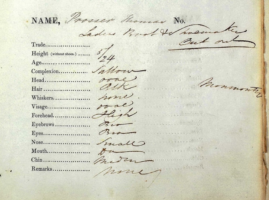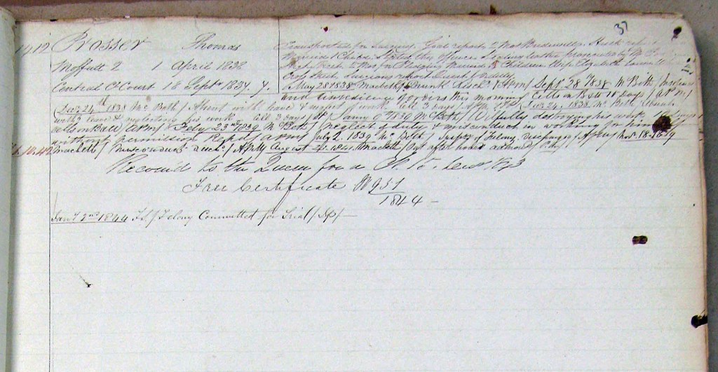 It seems that Thomas railed against the system upon arrival in Van Diemen’s Land or he had quite a conflict with McBeath, the cordwainer that he was assigned to. The details are sketchy because the assignment records for male convicts for the period 1836-1844 are missing, however it seems that after a few years Thomas Prosser accepted his fate or realised that he would be better off by “behaving” to secure his Ticket of Leave, Pardon and Freedom.