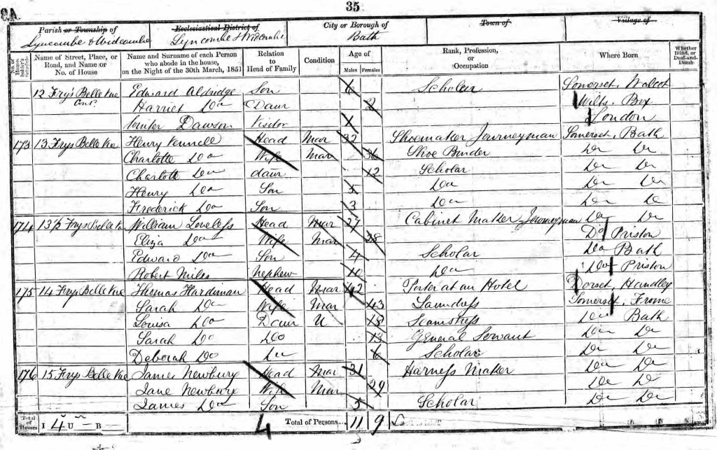 This possibility has more credence from the 1851 census. Sarah’s other sister, Elizabeth (1822-1874), had married a cabinet maker, William Loveless (1823-1874) in 1845 at the St. Philip and Jacob Church in nearby Bristol. The 1851 census records William Loveless, a cabinet maker and Eliza Loveless his wife, living at 13 ½ Frys Belle Vue in Lyncombe, Bath with their four-year-old son, Edward Loveless and a ten-year-old nephew, Robert Miles, born in Priston. Ann (Miles) Bishop, the older sister had tragically died in August 1850 and the family may have determined that Elizabeth and William were better placed to care for the ten-year-old Robert as George Bishop would have been fathering four sons. George remarried in December 1850 to an Ann Flower (1811-) and she and George may not have wanted to continue looking after a child that was not born to either of them.