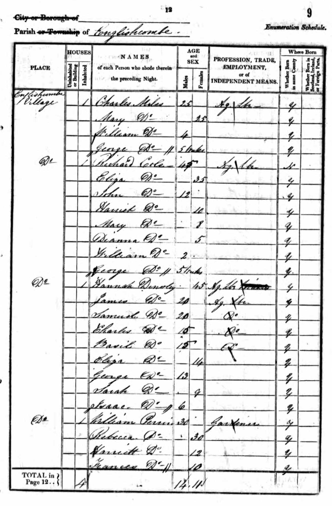 Charles Miles (1813-1902) married Mary Weston (1816-1888) in Englishcombe in 1835 and the census of 1841 shows them living in the Englishcombe village with two sons; William 4 years old and George 5 weeks old.