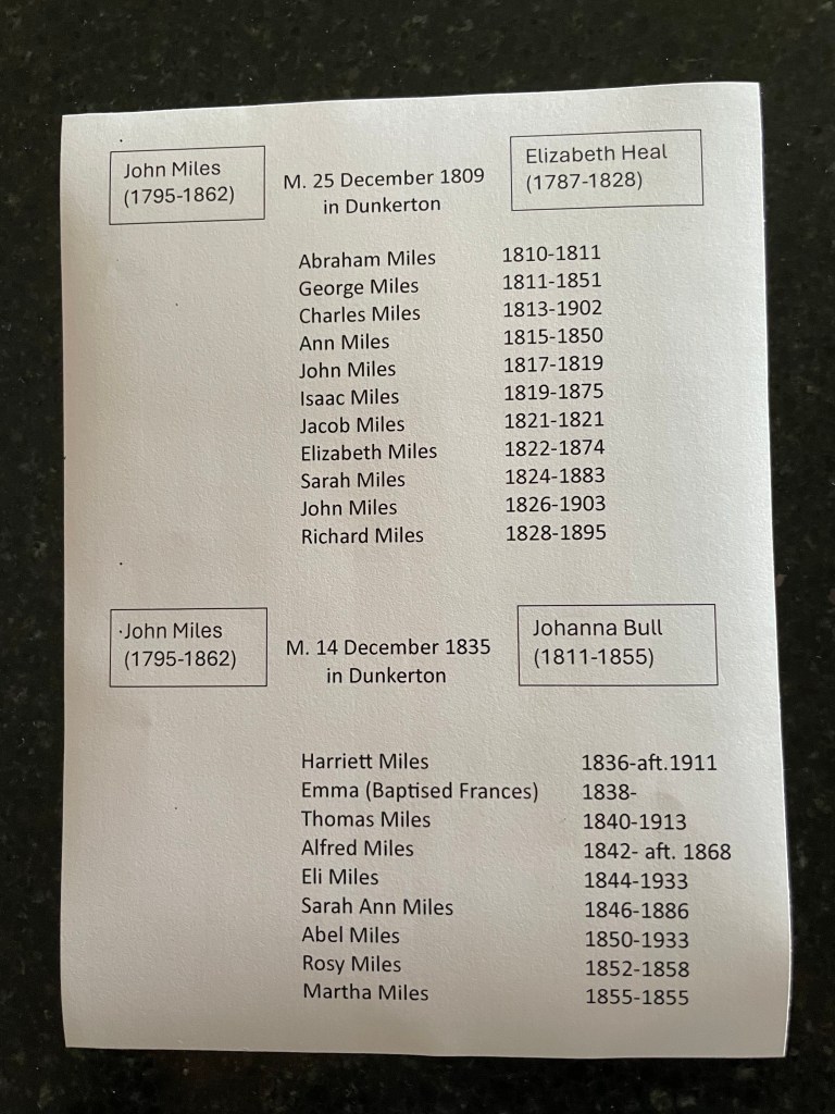 John Miles and his second wife, Johanna Bull had nine children during their twenty year marriage. All were born in Dunkerton except the last child, a daughter Martha who was born in Twerton, just across the river from Bath. The first of these nine children was a daughter, Harriett, born in 1836. She married, had children and had a granddaughter who migrated to Australia with her family in 1913.