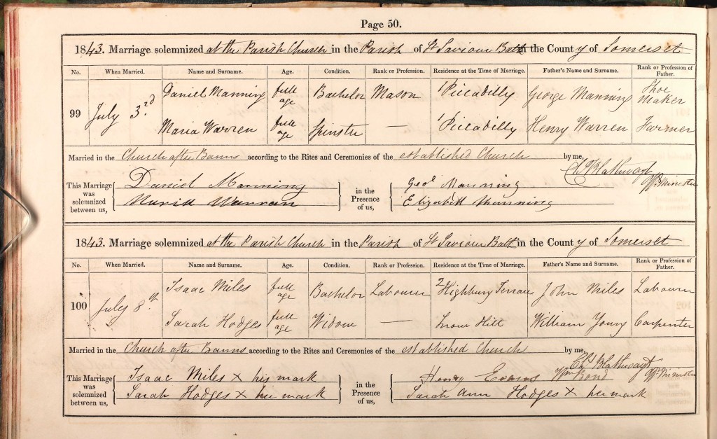On November 11th, 1841, Thomas Hodges was buried in Camerton and less than 2 years later, on 8th July 1843, his widow, Sarah Hodges married the much younger Isaac Miles at the St Saviour Parish Church on the northern outskirts of Bath, about 8 miles from Camerton. The mind boggles! The 1851 Census shows that they are no longer living together: Sarah Miles is living with her daughter, Ann and her husband Henry Lippiatt in Camerton while Isaac is a boarder in Keynsham at the house of James Cuddihy.