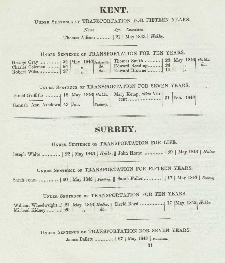 We can never know with any certainty how and why Sarah Miles (1824-1833) left rural Somerset for London. We do know that it did not end well, that she and three accomplices, Sarah Fuller (1826-1911) Joseph White & Thomas Allison were convicted for stealing clothes in Southwark. Joseph White was sentenced to transportation for life, Thomas Allison and the two Sarahs were each sentenced to 15 years transportation to Van Diemen’s Land, modern day Tasmania. Both Sarahs survived horrific conditions in gaol, transportation and living as convicts in a penal colony. They both married, they both had children, they both lived in Launceston but did not leave Tasmania.