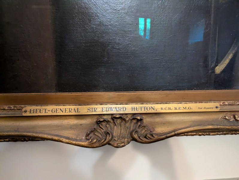 It was an oil painting by Tom Roberts of a very famous military figure: Lieutenant-General Sir Edward Thomas Henry Hutton, KCB, KCMG, DL, FRGS a British military commander, who pioneered the use of mounted infantry in the British Army and later commanded the Canadian Militia and the Australian Army. I “knew” this man as my great grandfather had given his eldest son the name Hutton as his middle name in honour and recognition of the esteem in which he held the General.