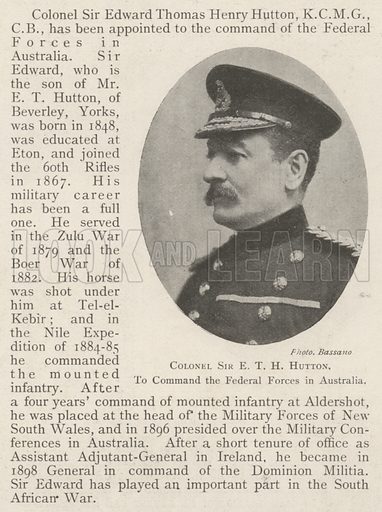 Hutton returned to England in March 1896. By the end of his command Hutton had become an important public figure. A convinced Imperialist, he quickly began to propagate his ideas on Australian defence, addressing members of parliament on the topic and the Aldershot Military Society on ‘Our comrades of Greater Britain’. In that address the concept of the Australian soon to be popularised by Charles Bean was already discernible: