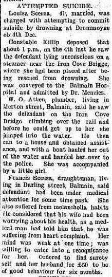 On December 4, 1903, Louisa Sceusa, who had been ill with depression for years, attempted suicide by throwing herself into the harbour from Sydney’s Iron Cove Bridge. Saved by a passerby, she was taken to the Balmain hospital.