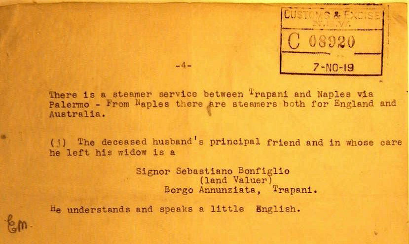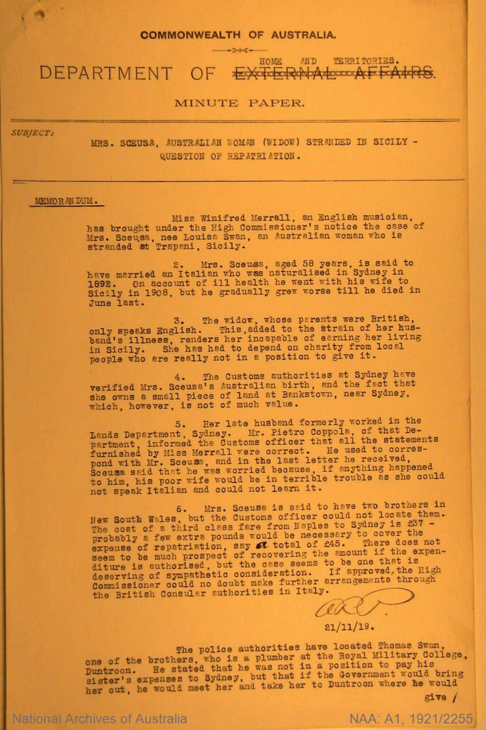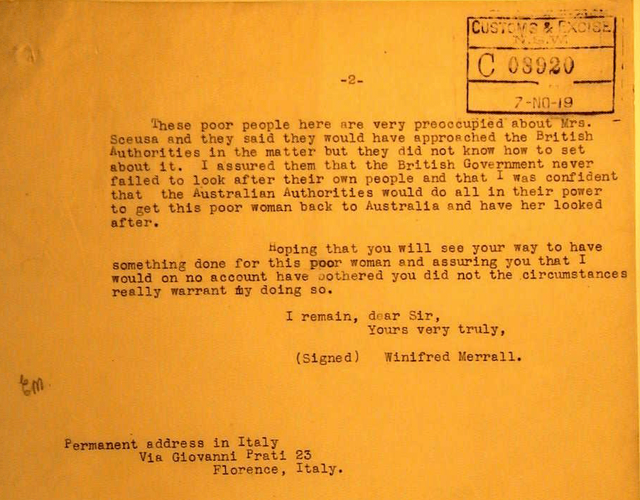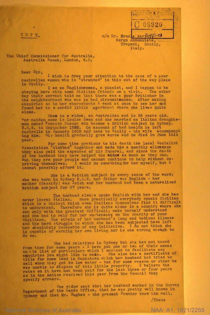 In October 1919, an English pianist, Winifred Merrall, visiting Trapani, learned of Louisa’s conditions, and wrote to the Australian High Commissioner in London, urging her repatriation, also in consideration of the fact that the then Australian Prime Minister, William Morris Hughes, knew Sceusa well.
