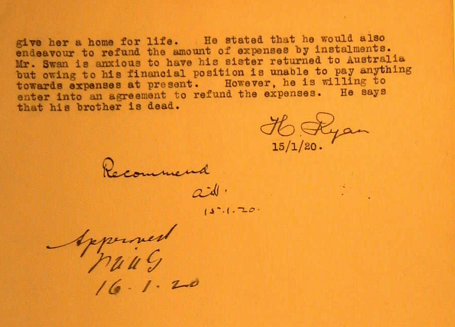 There are 46 pages of communication in the official Australian Government files regarding Louisas repatriation back to Sydney. They show that Louisa’s brothers, Thomas Swan and Hadyn Swan are identified and that Thomas, when contacted at Duntroon, Canberra, where he is working as a plumber, is very keen to have Louisa back in Australia where he would like to house and care for her. Thomas also states that his brother Hadyn is no longer alive. In his communication Thomas says that he would appreciate some financial assistance with the repatriation as he is unable to immediately settle the costs involved and that he would be pleased to enter into an agreement concerning the refund of his sister’s expenses. Communication between the various parties involved is at times disjointed with letters and memorandums not always in chronological sequence. This process is occurring between 1919 and 1920, a time without the benefit of current modern digital correspondence.