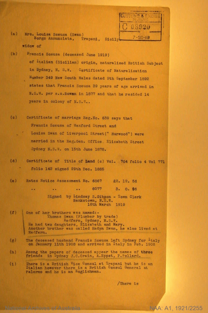 Francesco Sceusa and Louisa Swan left Sydney on January 10, 1908, on board the SS Oruba for Naples, where they re-embarked on a vessel, ironically bearing the name of Umberto I, to arrive in Trapani on February 22nd. They lived in a poor apartment in Via Argenteria (Contrada Casasanta), owned by Santo Buddua, a former leader of the peasant movement.