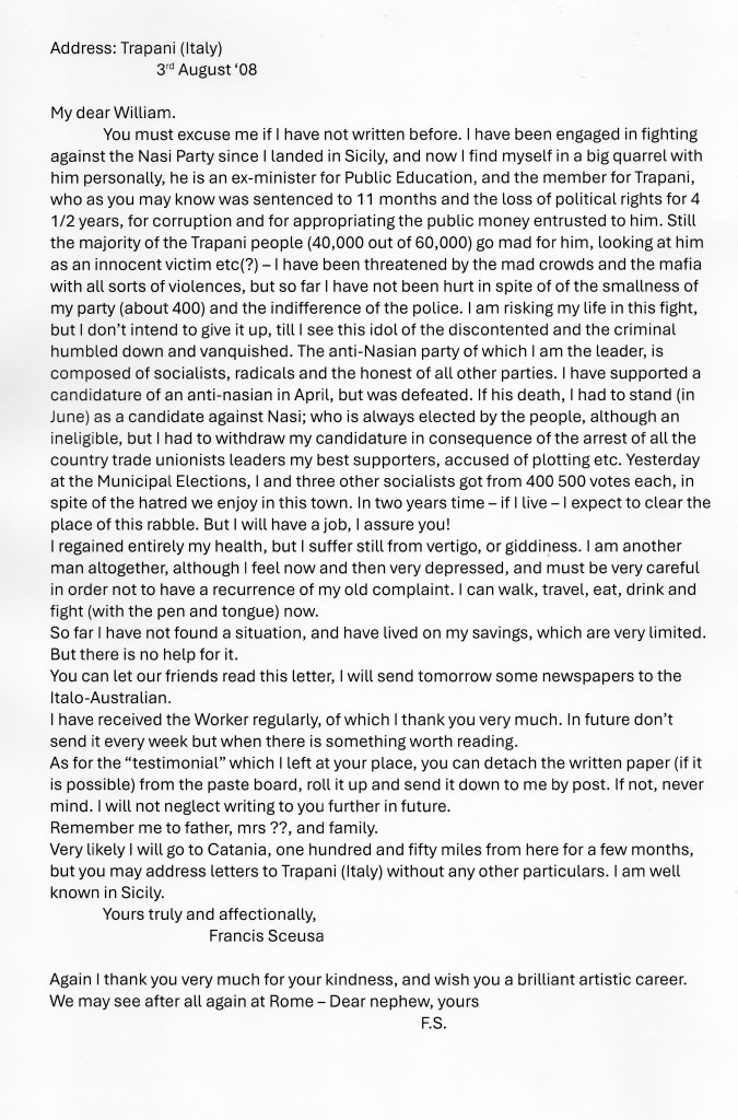 The following article is a short sketch of Francesco’s life from the Australian Dictionary of Biography, Volume II,written by the Australian historian, Gianfranco Cresciani which shows the dynamism of Francesco Sceusa and the difficulty Louisa Swan would have had in assimilating into his sensitive and highly strung life.