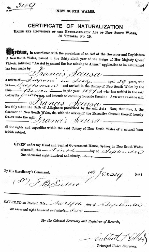 At the same time the Truth news-sheet of Sydney, accused Sceusa of being a foreigner, of not having acquired the British subject, stating that no man can honestly serve two countries as different as Australia and Italy. He must be a traitor to one or the other. Sceusa, aware that his political activities in Australia could give rise to a request for deportation by the Italian Government, applied for a Certificate of Naturalisation, which was granted to him on September 9, 1892.