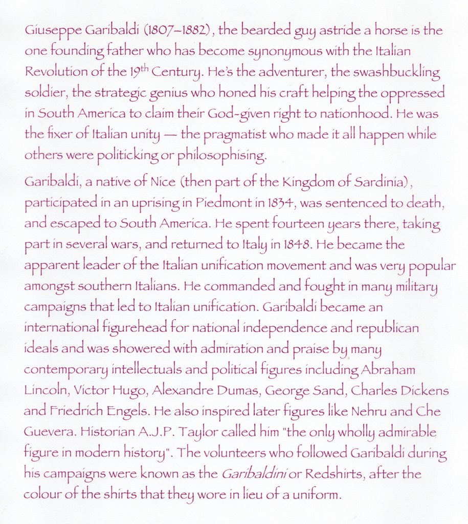From an early age, Francesco Sceusa, born in Trapani, Sicily 1851, was a voracious reader of literature on socialist issues during a period of great social and political upheaval throughout Italy. Central to this upheaval was a swashbuckling magnetic leader – Giuseppe Garibaldi (1807–1882) a general who is widely recognised as one of the “fathers of the fatherland” during the unification of Italy (Risorgimento). Garibaldi’s landing in the Sicilian port of Marsala in May 1860 with more than 1000 volunteers is the piece of history most Italians can remember from school; La Spedizione dei mille, the Expedition of the Thousand, is modern Italy’s First Fleet. It was during the battle of Calatafimi, in Sicily, that Garibaldi was said to have dropped the quote that would guarantee him a place in the Risorgimento’s pantheon: “Here we either make Italy, or we die.” He could have left it there and we’d still know his name. But he kept going, crossing the Strait of Messina and weaving his way up the mainland, fighting battles against the troops of the Kingdom of the Two Sicilies and cutting short the reign of the last Bourbon king of Naples, Francis II. I have no doubt that Garibaldi was an early hero of Francesco’s. A broader view of Garibaldi is here.