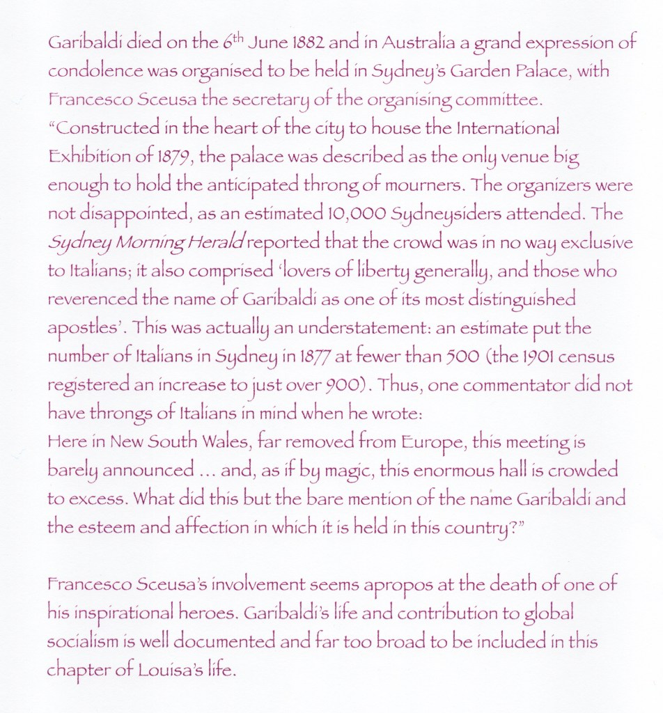 I did find a small book on Francesco written by Flavia Fodale which included a 3-page chapter on Louisa, addressing some of the difficulties she faced during their marriage as the “foreign” wife of a dynamic, forceful and confrontational political agitator who could and would act in a communistic and anarchistic manner if he felt any situation demanded it.