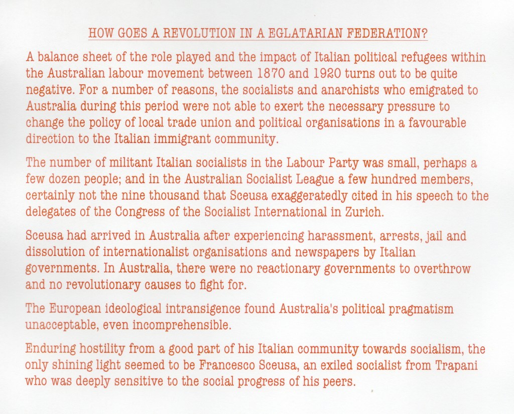 From the end of 1877 until January 1908, the year in which Sceusa made a definitive return to Trapani, he held himself faithful to these principles and worked tirelessly for their realisation. However, his political thinking matured over the years, as a consequence of contact with an Australian socialism and Labourism profoundly different from his European experience. His initial radicalism, the anarchist propensity for revolution faded, to disappear completely in comparison with Australian pragmatism.
