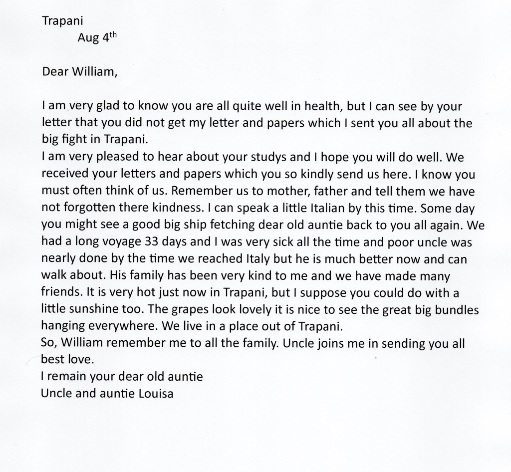 Two letters, from Francesco and Louisa, both to William Swan have survived. William was the older of the two sons of Thomas C.C. Swan and his wife, Esther. They were written in early August 1908 and indicate that Francesco had immediately involved himself in local politics, establishing a party to contest elections which does not seem to be successful.