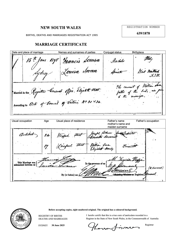 Louisa’s story is very sad. She was seventeen when she married Francesco at the Sydney Registry Office, just a few weeks before her eighteenth birthday. The marriage document shows that her father, William Swan, signed his permission for her to marry Francesco. For the entirety of their married life Louisa played a quiet, supportive role to her obsessive and politically driven Sicilian husband.